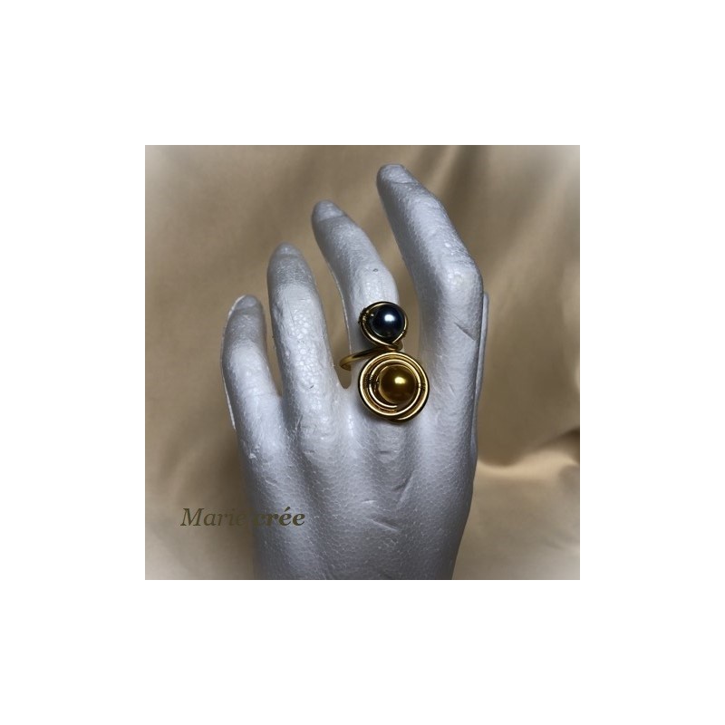 Bague en fil d'aluminium doré avec 1 perle en verre nacrée jaune et 1 perle en verre nacrée gris bleu.