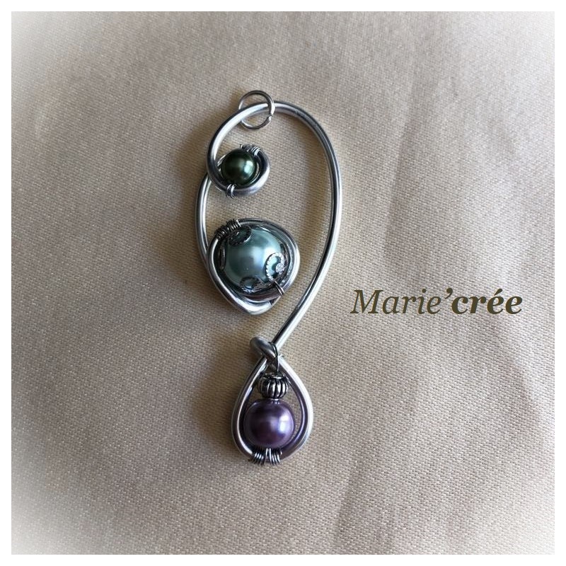 Pendentif en fil d'aluminium argent avec 1 perle en verre nacrée verte, 1 perle en verre nacrée bleu clair, 2 coupelles argentées et 1 perle en verre nacrée violette.